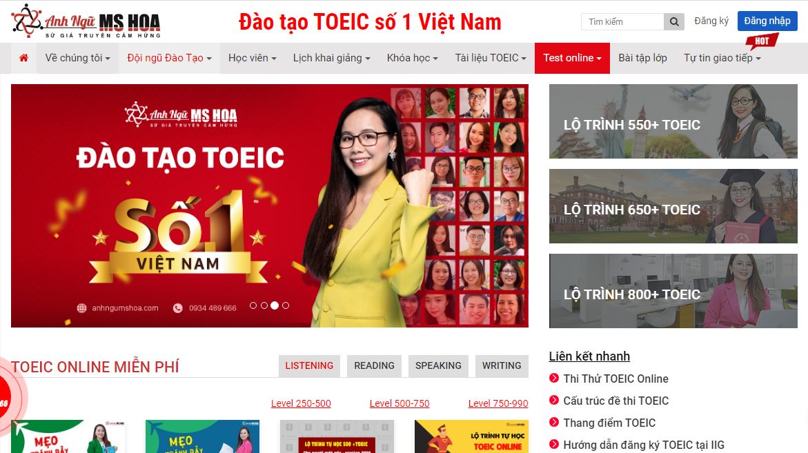 Website này mình được biết đến là do thầy Trọng Vinh bên Anh ngữ Ms Hoa giới thiệu để học thêm khi biết rằng mình cần gấp (hơn 700 TOEIC) trong thời gian ngắn. Việc kết hợp học các kiến thức thầy hướng dẫn trên lớp và ôn thêm ở nhà các đề thi TOEIC sẽ luyện được cho mình sức chịu đựng cho cả 2 bài Listening và Reading nha, đó là một trong các yếu tố quan trong giúp bạn được điểm như mình mong muốn đó.
