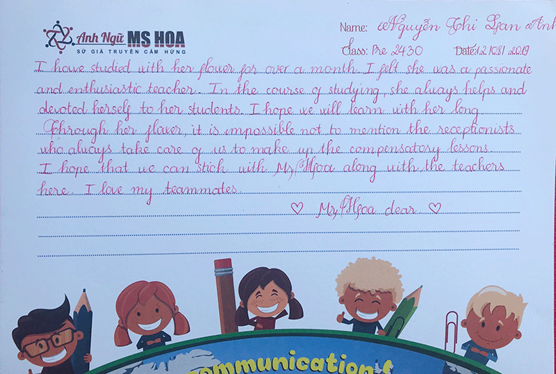 Bạn Dương Thị Thùy Trang chia sẻ: “Giáo viên nhiệt tình, kĩ năng sư phạm tốt. Tương tác tốt với học viên: truyền cảm hứng tốt cho học viên. Phát âm chuẩn, giọng nói to, rõ ràng, truyên cảm. Em xin chân thành cảm ơn cô Bùi Thị Của đã truyền cho em nguồn cảm hứng với tiếng Anh. ^-^”